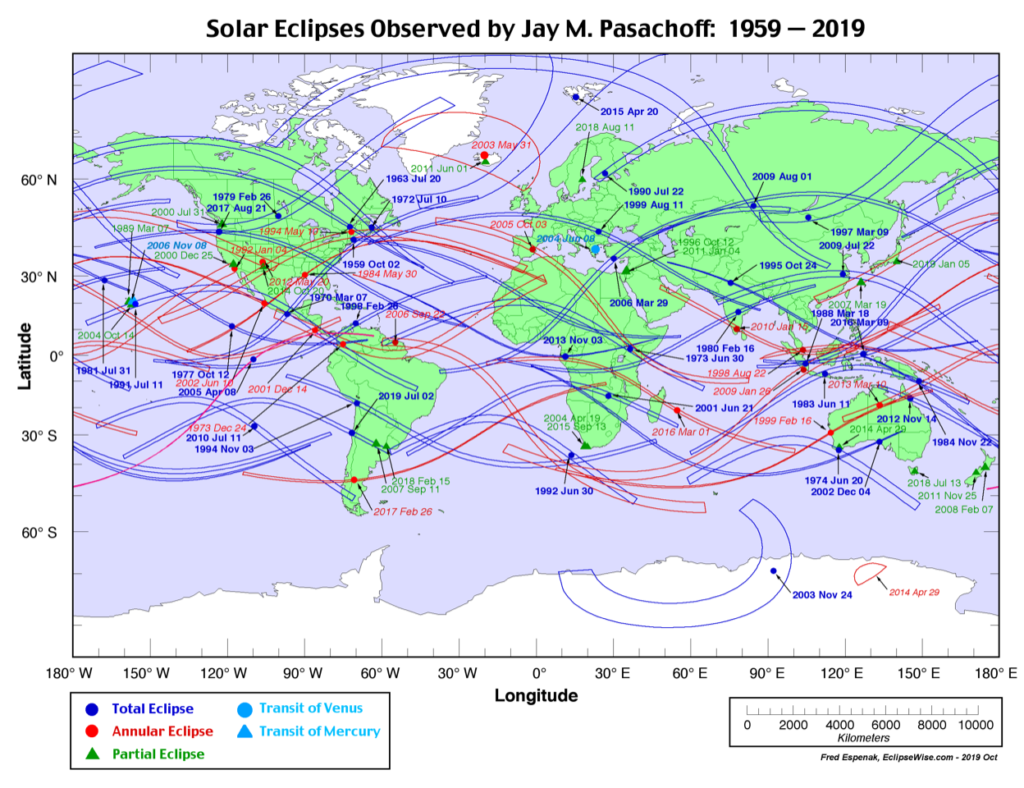 As a veteran of 72 solar eclipses —including 35 total solar eclipses, 18 annular solar eclipses, and 19 partial solar eclipses— astronomer Jay Pasachoff is uniquely positioned to share recent scientific work related to eclipses, international coordination of observations, and future plans. What role does mathematics play in predicting eclipses, from the ancient saros observations to Halley’s 1715 map, and up to today’s web-based zoom-and-click maps? How do theoretical predictions based on magnetic-field measurements, emission spectra of high ionization lines, and radio observations compare to the high res images available today?
