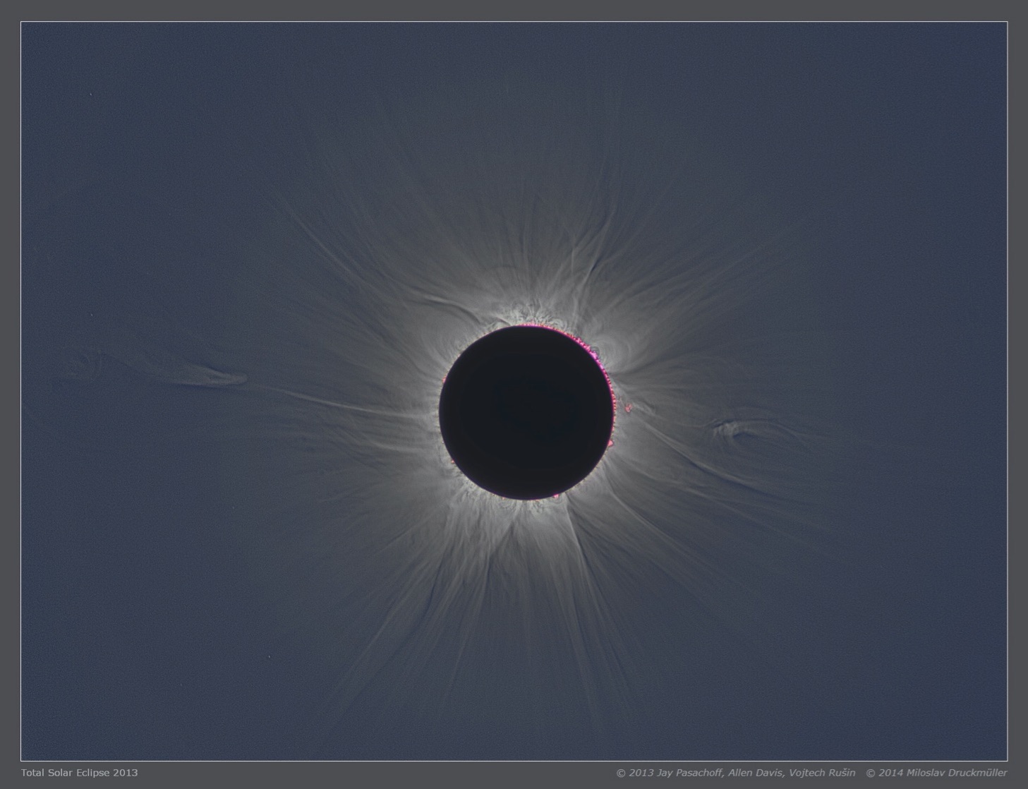 A composite image of the 2013 total solar eclipse at solar maximum. (Photos by Jay Pasachoff, Allen Davis, and Vojtech Rusin; computer compositing by Miloslav Druckmüller)
